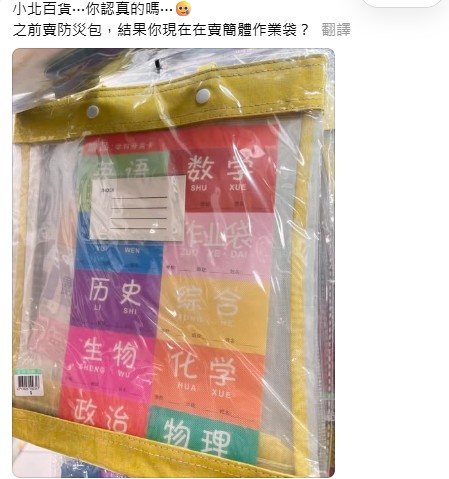 台灣有親綠網友近日於社交平台Threads發文,稱“小北百貨你認真的嗎,之前賣防災包,結果你現在在賣簡體作業袋?”從其曝光的照片可見,透明作業袋內的學科分類卡有多個科目,包括英文、數學、化學、物理、歷史以及政治等,全為簡體字書寫,下方還註有大陸常用的漢語拼音。