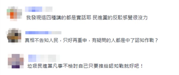 對此,島內網友認為,民進黨的反駁蒼白無力,“這四種講的都是實話”,更批評民進黨將民眾的批評抹黑為“認知作戰”。