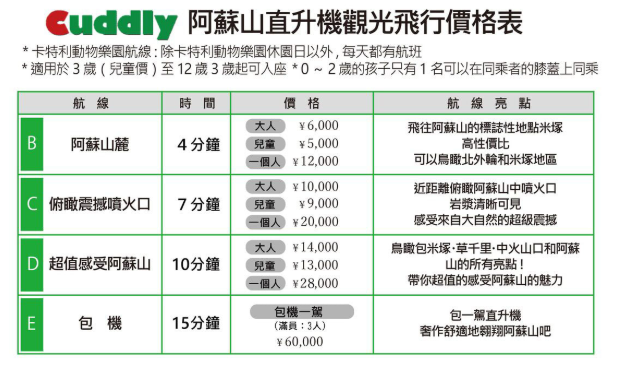 “阿蘇卡德利動物樂園”提供的直升機觀光行程。標價為日圓。(圖源:官網)