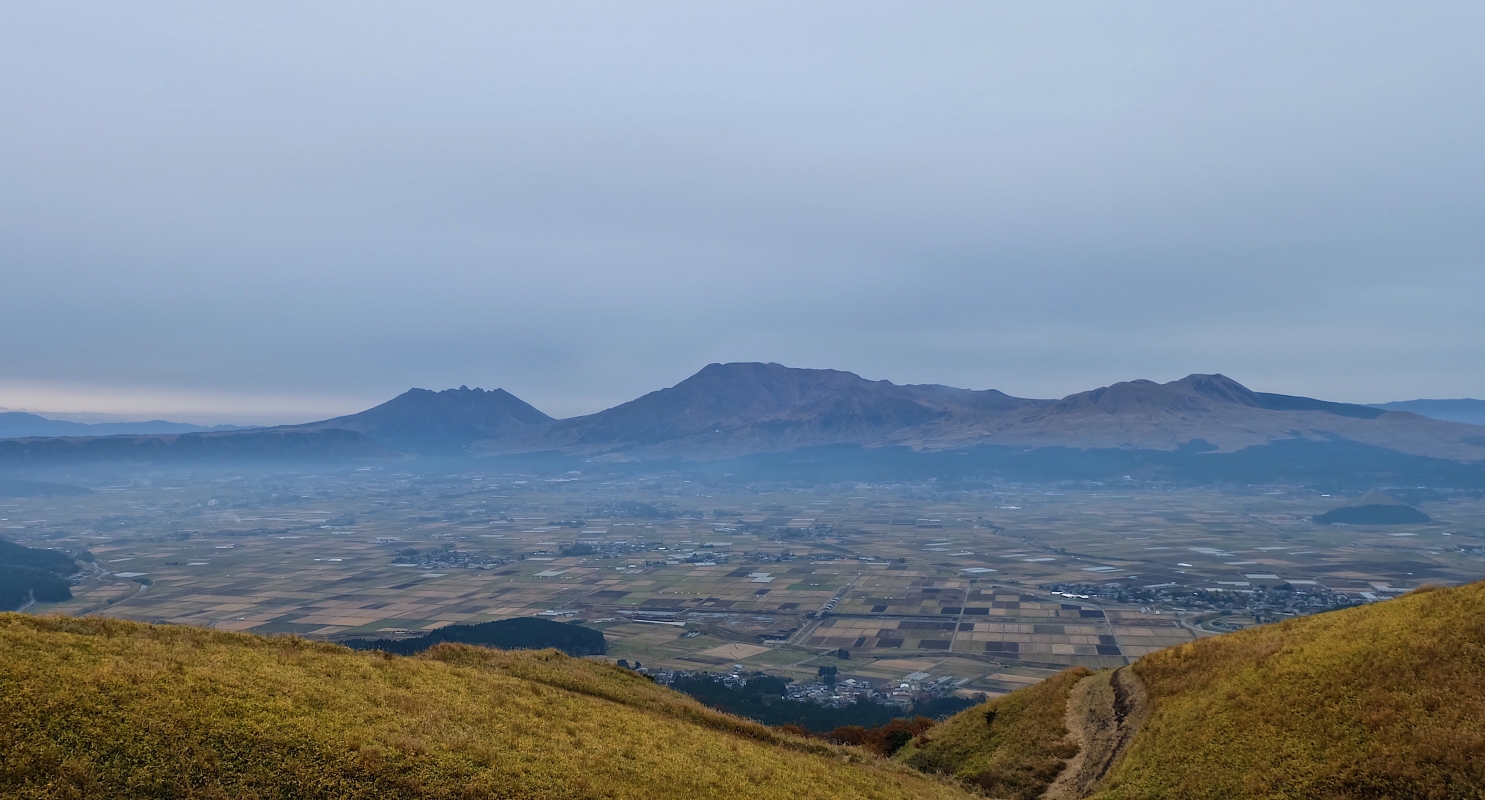 由“大觀峰”遠眺阿蘇火山。(香港中通社記者 黃璇攝)