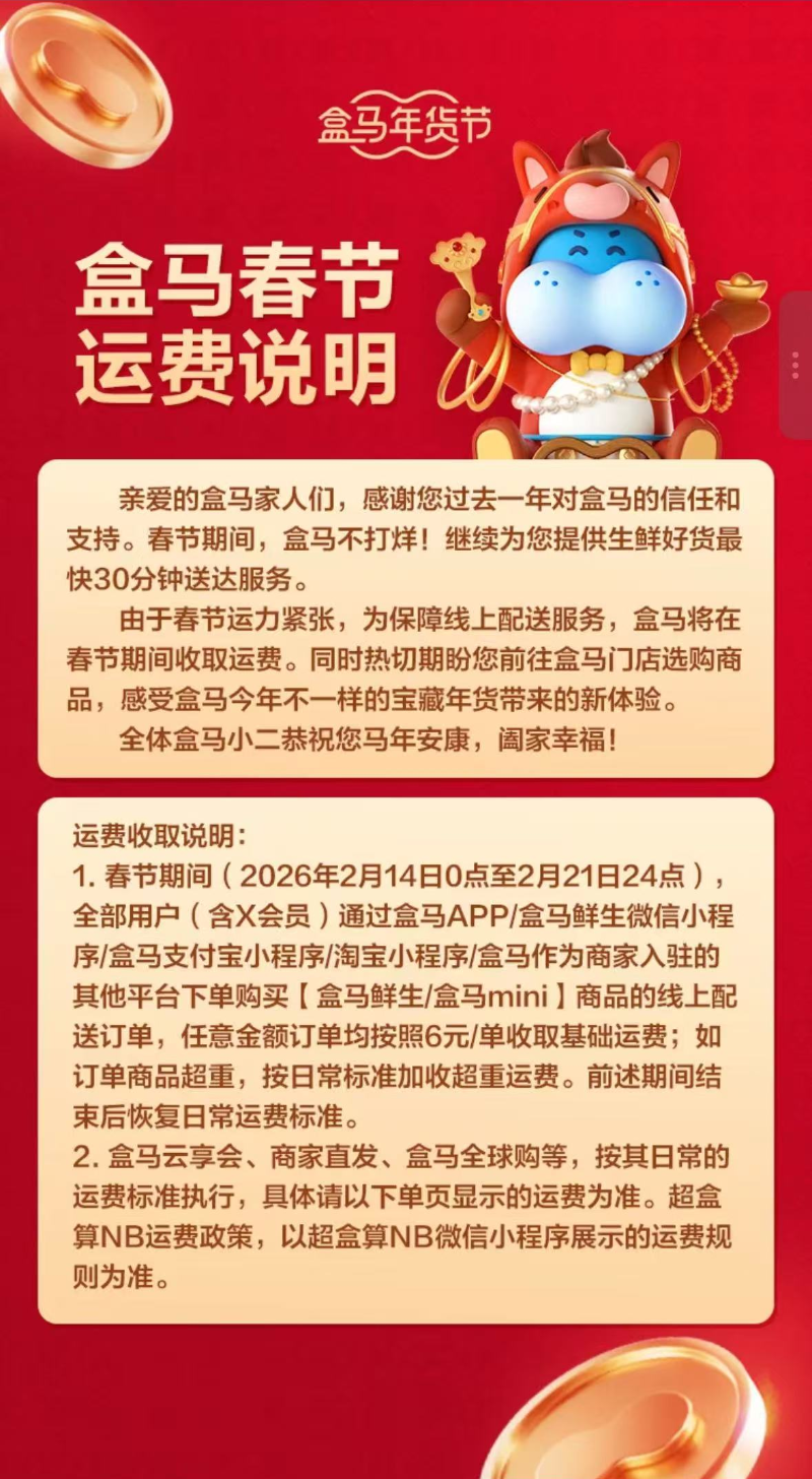 根據最新公告,山姆會員商店將於2月11日至24日每單加收3元(人民幣,下同)“春節運費”,用於補貼堅守崗位的配送員;盒馬則在2月14日0點至21日24點期間,對所有用戶(含X會員)統一收取每單6元基礎運費,無論訂單金額大小;叮咚買菜也延續往年做法,在2月15日至21日(臘月廿八至正月初五)每單額外收取3元春節服務費。三家企業均強調,調價主因是“春節運力緊張”,旨在保障節日期間配送不斷檔。