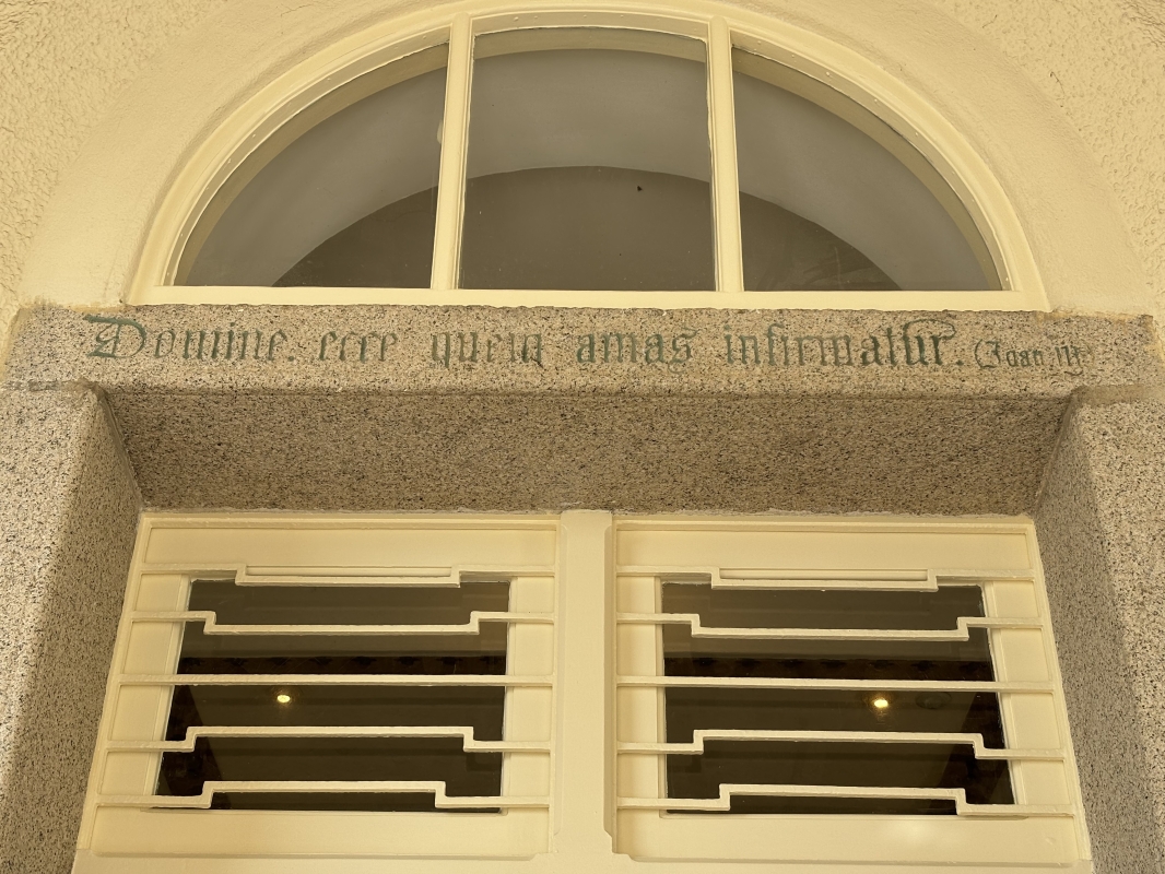 門楣上的拉丁文箴言“Domine, ecce quem amas infirmatur”,意為“主啊,你所愛的病了”。(香港中通社記者 黃璇攝)