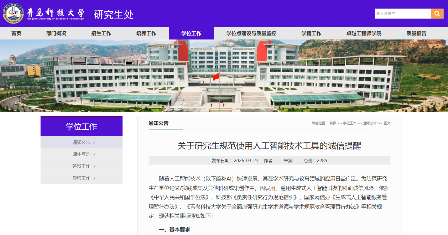 綜合24日消息,青島科技大學研究生處23日強調,學位論文須由研究生在導師指導下獨 立完成,AI僅可在參考文獻檢索、非創新性方法輔助等有限範圍內使用。