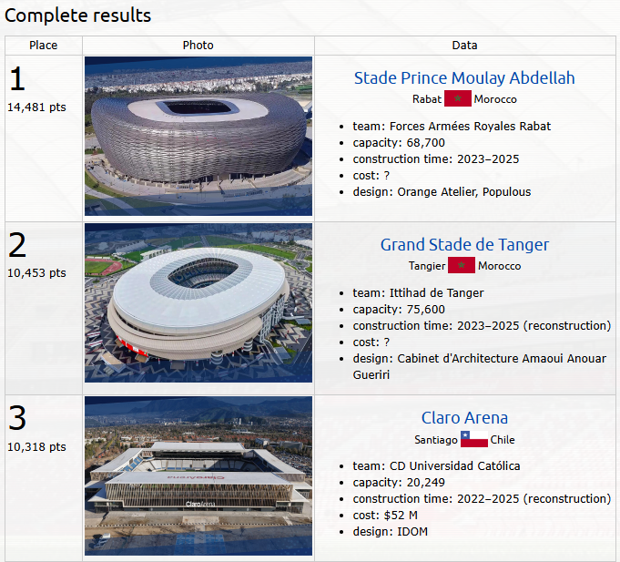 為了籌備2025年非洲杯和2030年世界杯,摩洛哥近年來的體育場館建設突飛猛進。拉巴特的穆萊·阿蔔杜拉王子體育場以14,481分的絕對優勢登頂。