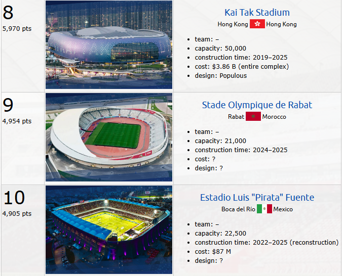 從公佈的榜單來看,北非國家摩洛哥依託籌辦大賽的狂熱足球氛圍與較高的國民關注度,強勢包攬冠亞軍;造價超十億美元的英超埃弗頓全新主場位列第四。