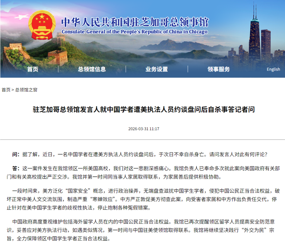 中國駐芝加哥總領館發言人指出,一段時間來,美方泛化“國家安全”概念,進行政治操弄,無端盤查滋擾中國學生學者,侵犯中國公民正當合法權益,破壞正常中美人文交流氛圍,製造嚴重“寒蟬效應”。中方嚴正敦促美方徹查此案,向受害者家屬和中方作出負責任交代,停止針對在美中國學生學者的歧視性執法,停止炮製各種冤假錯案。