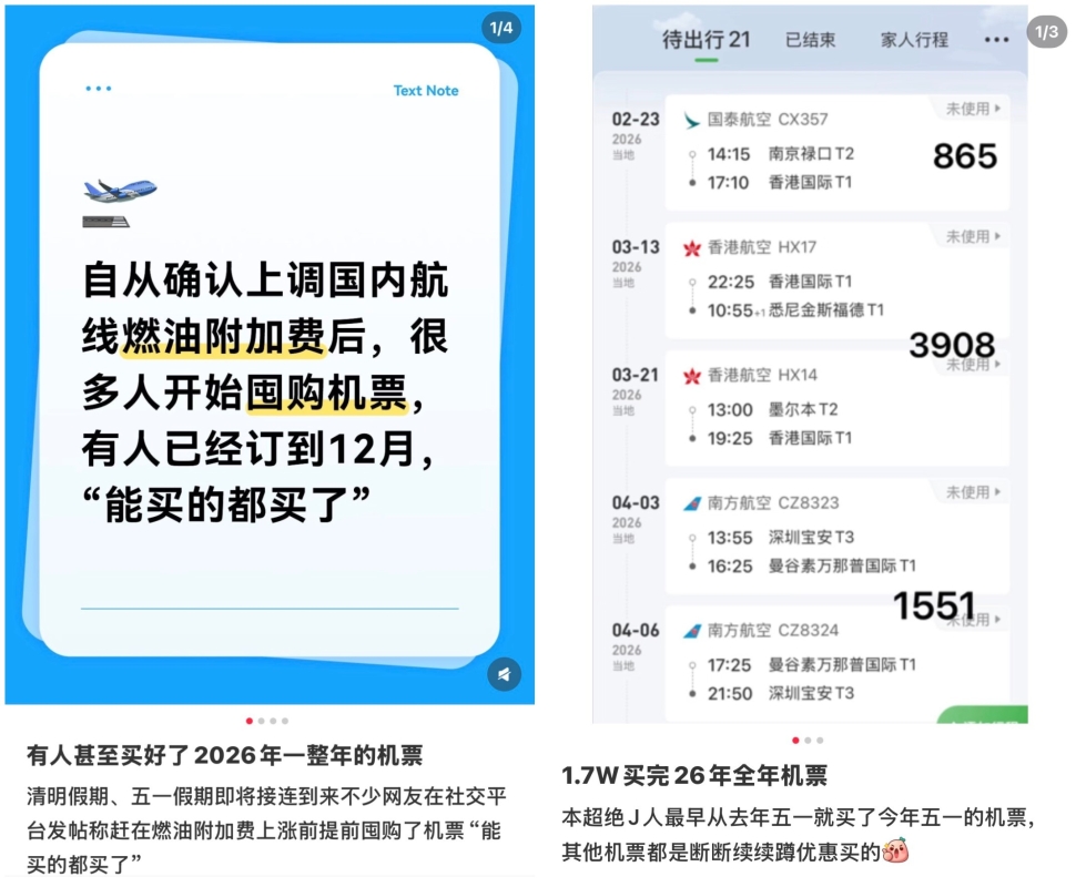 在航司集體宣布漲價之前,內地社交平台上就掀起“囤票鎖成本”熱潮。